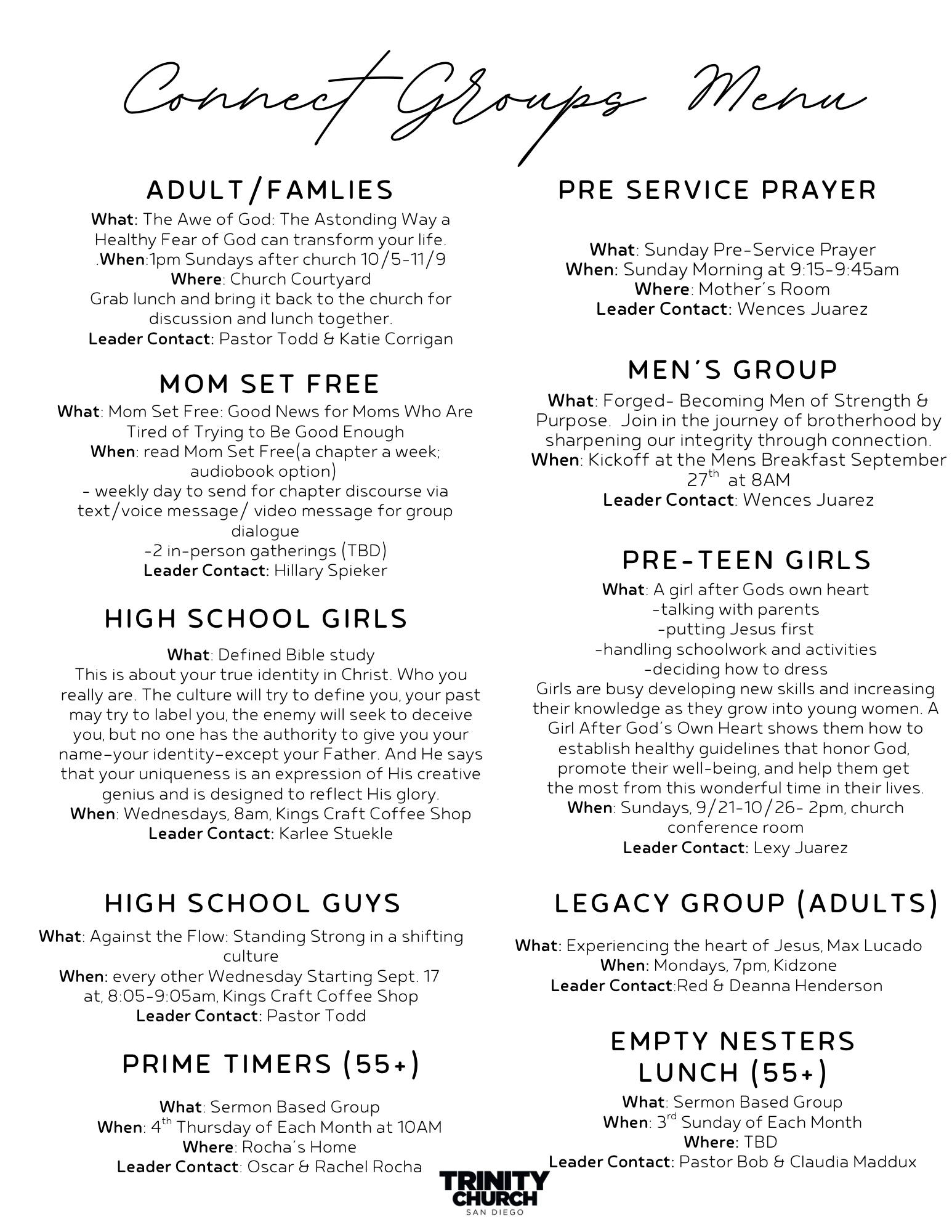 Connect Groups are designed to help every member at Trinity find a group of people with whom they can belong. Connect Groups happen every day of the week all over the area. Whatever you are passionate about we have a group where you can get connected.